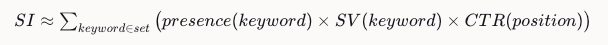 Wobei presence(keyword) nur dann „zählt“, wenn du in den betrachteten organischen Ergebnissen rankst. (Die Prinzipien „Gewichtung nach Suchvolumen und Klickwahrscheinlichkeit“ + „Summierung“ sind so beschrieben.) (siehe ebd.)
